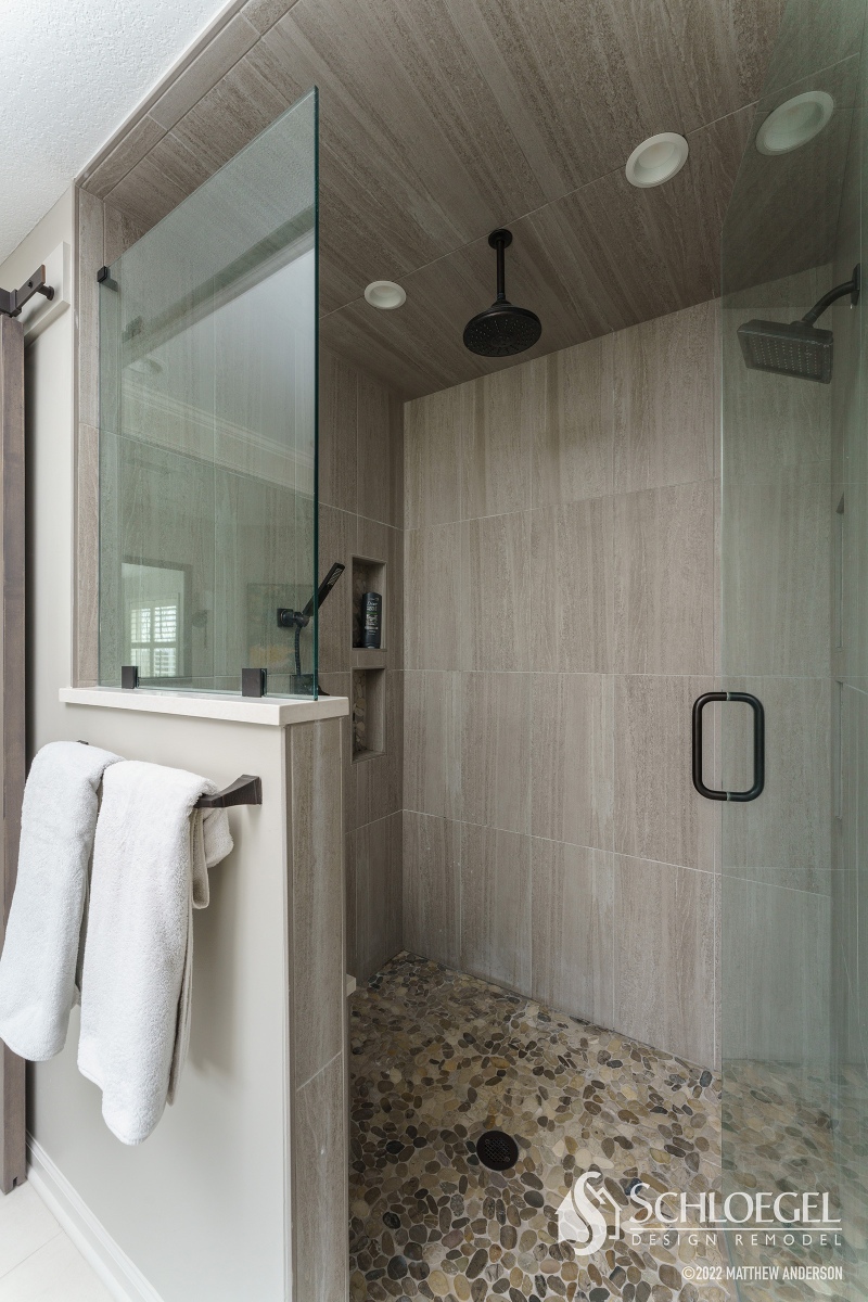 The bathroom now has two distinct vanities and well-placed storage. In the shower we replaced the dated, white square tile and pan with large format tile walls and a natural pebble floor.
