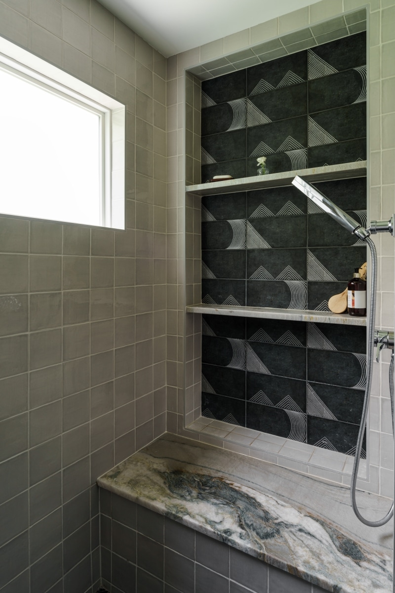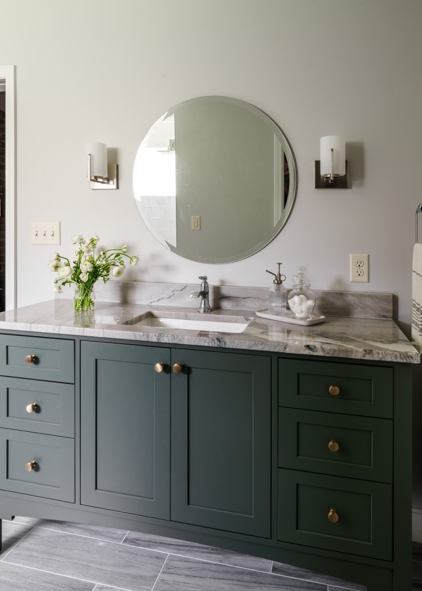 This Fairway remodel transformed a dated primary bath into a fresh, modern retreat. We removed the bulky corner jacuzzi tub to make way for a spacious, glass-enclosed shower featuring striking tilework and dual shower heads. The vanity area saw a dramatic upgrade with a custom green vanity, a stunning stone countertop, and elegant brass hardware. Thoughtful lighting and a sleek round mirror complete the updated, polished look.