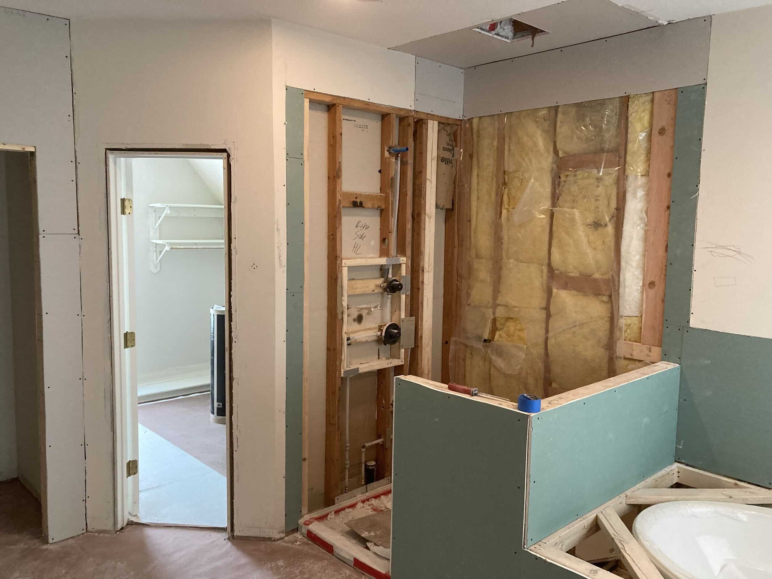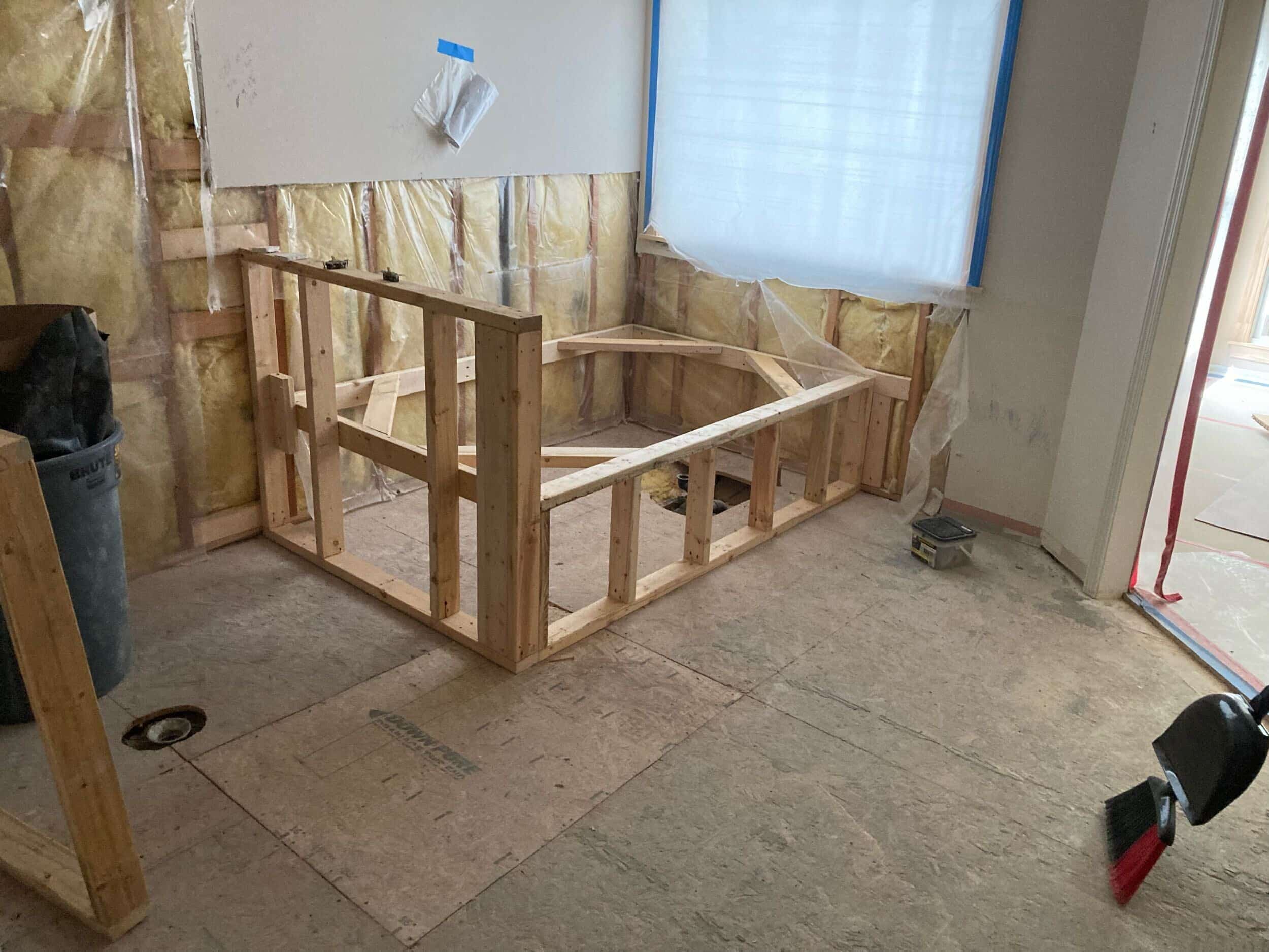 After demo, the team worked on framing for the new tub and shower wall. We also worked with our sub-contractor partners to handle the plumbing and electrical rough in phases of the project.