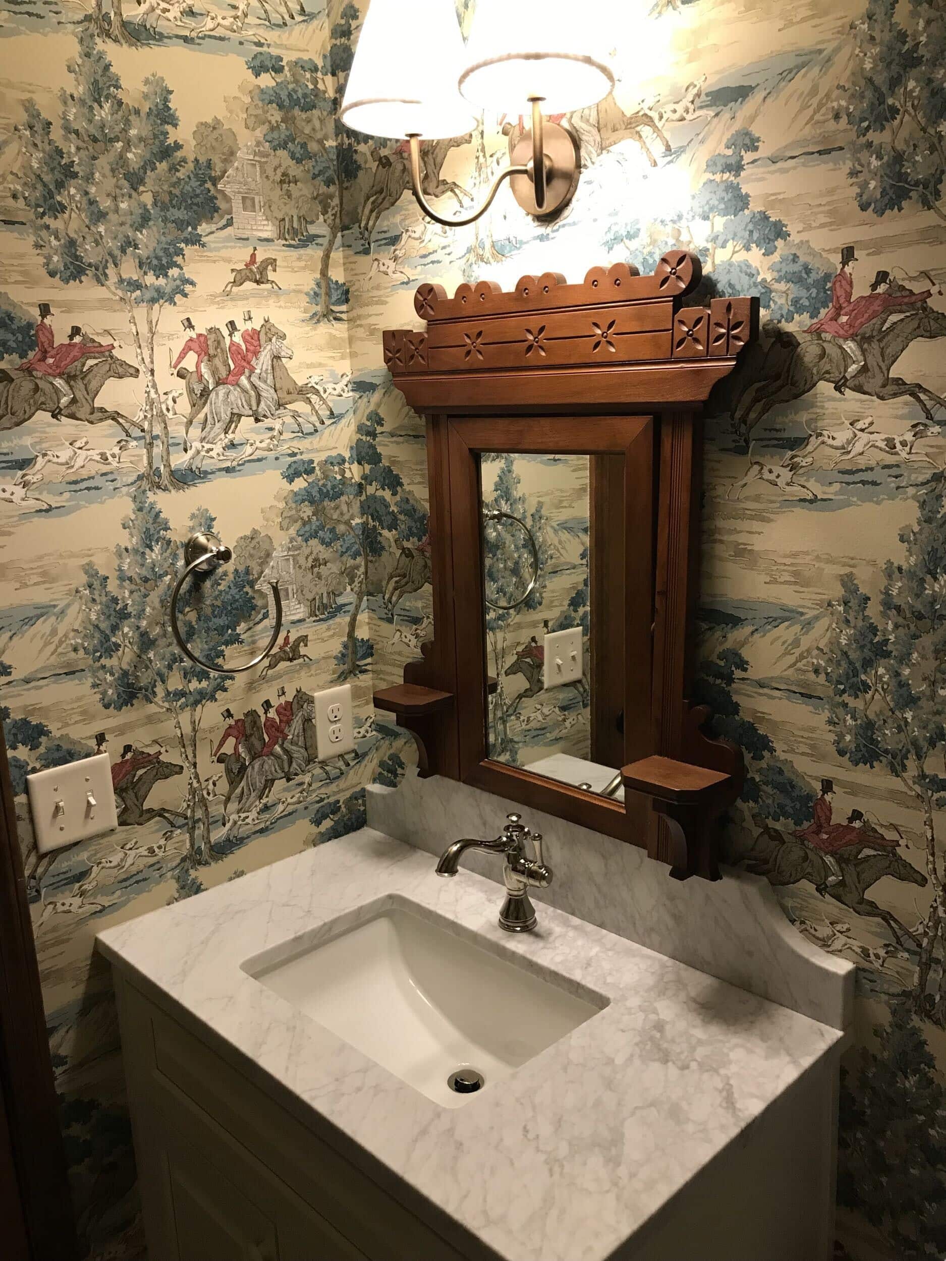 The main floor powder bath is now a charming showstopper. The wallpaper adds character and makes a statement in the best way. It complements the family mirror, and the honed edge backsplash adds a little interest.