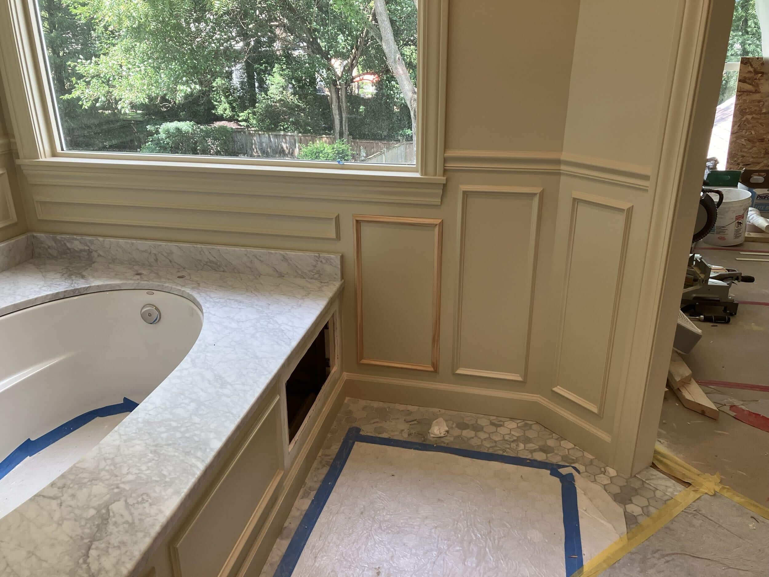 For the primary bathroom, we knew we wanted to add a wainscot trim detail and undermount install the soaking tub. The vanity would be cherry wood with a Carob stain to create the perfect warm rich tone. For the counters, the clients and team chose, Bianco Carrara Honed 3cm Marble with a fun backsplash edge detail to add a little interest.