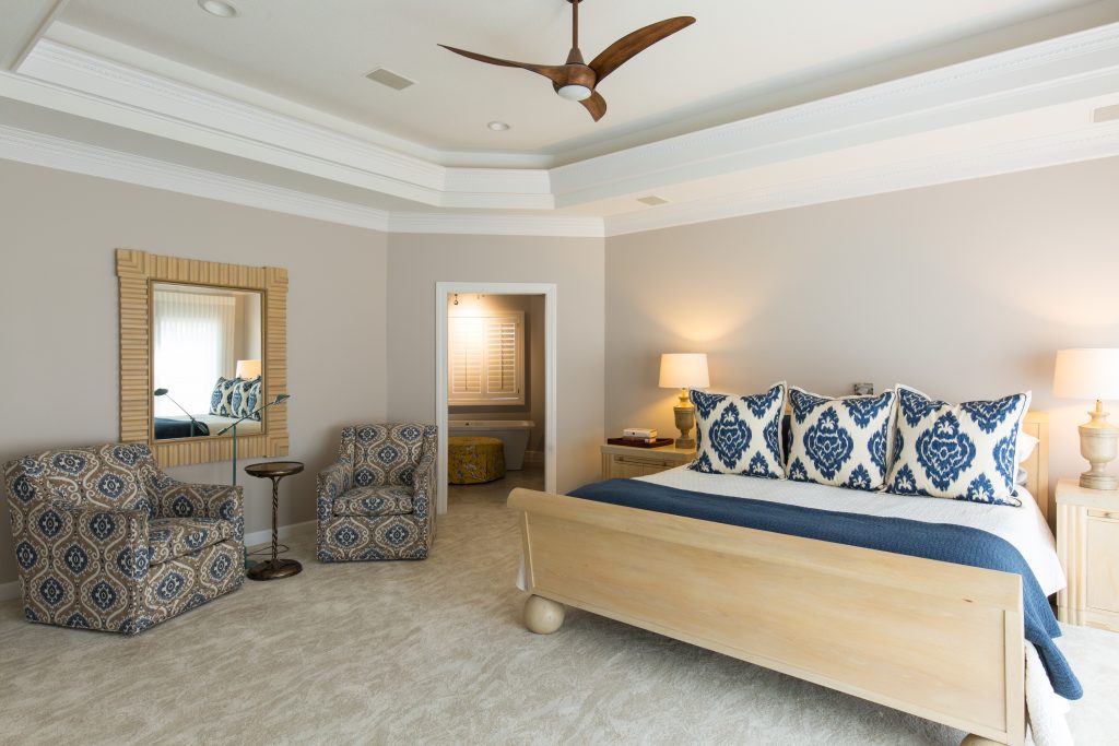 Our team took out the two pillars and reworked the ceiling above the tub creating a beautiful arch. And speaking of the tub, wow! The new stand along soaking tub brings in clean lines and the tub filler is an art fixture of itself. Taking out the tub deck allowed us to move the vanity down and add extra square footage to the shower. The cocoa-stained dual vanities otherwise stayed in their existing locations. The dark stain is classic and timeless and again a bit tropical while also a nice balance to the marble style porcelain tile floors and light gray painted walls. The vanities are topped with beautiful and subtle Cambria Devon tops. A chandelier elevates the entire space and makes the bathroom a true retreat.