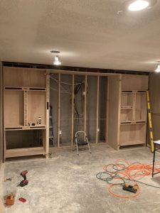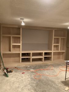 The initial plan was to make the entertainment center much as it had been. There were to be cubbies in the drywall for the TV and each of the three speakers, as well as cabinets on each side for storage.