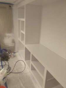 After lightly sanding and vacuuming every inch of the bare wood–top, sides, bottom, back of each cubby–we sprayed on a prime coat.