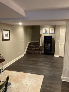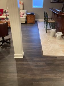 The stairs did get some swanky new carpet, but we needed another flooring option for the rest of the basement space. We could have continued with the tile already present in the bar area; it had just demonstrated its hardiness by surviving the disaster that had taken the carpet. A good hard tile, however, is quite costly. Installation is heavy, messy work best performed by an experienced tradesperson. Crucially, basement tile is no place for bare feet that like to keep warm. We went with an option that is rightfully taking the remodeling industry by storm, luxury vinyl plank, or LVP.