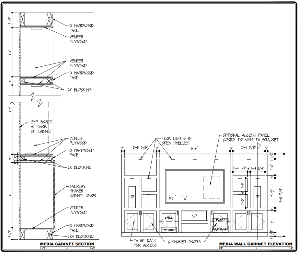 Why build an entertainment center into the wall when we could build the wall into an entertainment center? The homeowners had already acquired the TV and the speakers that would be featured in the space. All the other parts of the piece would be to complement the operation of the system. Leslie proportioned and configured the whole wall around the key components of the entertainment center.