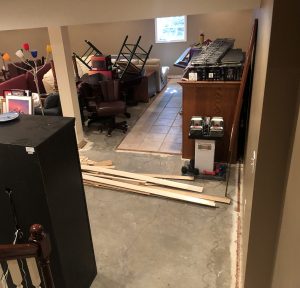 The stairs did get some swanky new carpet, but we needed another flooring option for the rest of the basement space. We could have continued with the tile already present in the bar area; it had just demonstrated its hardiness by surviving the disaster that had taken the carpet. A good hard tile, however, is quite costly. Installation is heavy, messy work best performed by an experienced tradesperson. Crucially, basement tile is no place for bare feet that like to keep warm. We went with an option that is rightfully taking the remodeling industry by storm, luxury vinyl plank, or LVP.