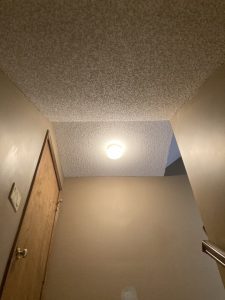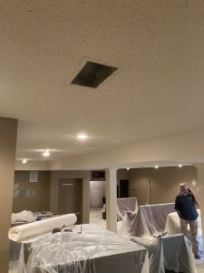 While the original plan involved only fixing the water-damaged areas, we convinced our clients the popcorn ceilings needed to go.