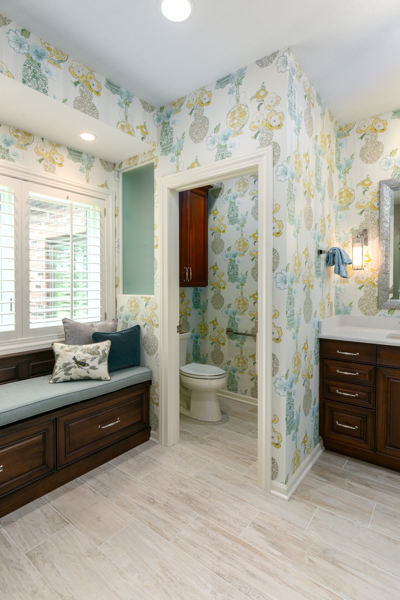 This stunning primary bathroom remodel, designed by Donna Kirsopp, in Lee's Summit showcases the perfect blend of traditional elegance and modern functionality. By removing an unused tub, the space was transformed into a luxurious retreat with a large zero-entry shower. The custom-built walnut bench, paired with beautiful wallpaper, adds a touch of sophistication and warmth. This bathroom is not only visually appealing but also highly functional, offering a relaxing and accessible bathing experience.