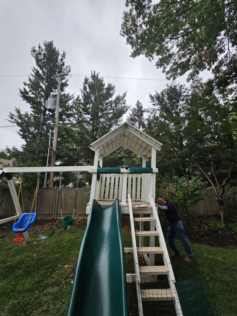 When it comes to kids’ play equipment it’s important to make sure the finished piece is structurally sound and assembled correctly to avoid malfunction and possible injury. By outsourcing this task to our handymen, you’re enlisting the help of experience builders with the proper tools and equipment. This backyard playset was damaged in a storm that left it with a significant lean and the vinyl finish torn, leaving the wooden structure exposed to the elements. The lag bolts that once held it together were no longer secure. To fix the playset, we disassembled the entire thing, gave it a power wash, coated the exposed wood in weatherproof exterior paint, and created new holes for the lag bolts so the entire structure was sound once again. Now these clients can be confident that the playset is safe.