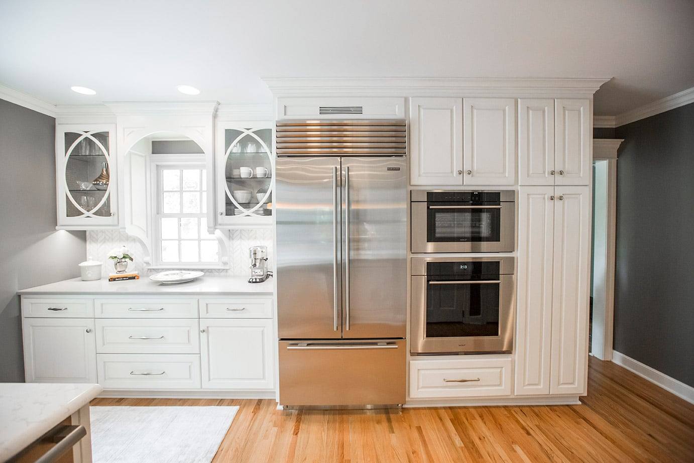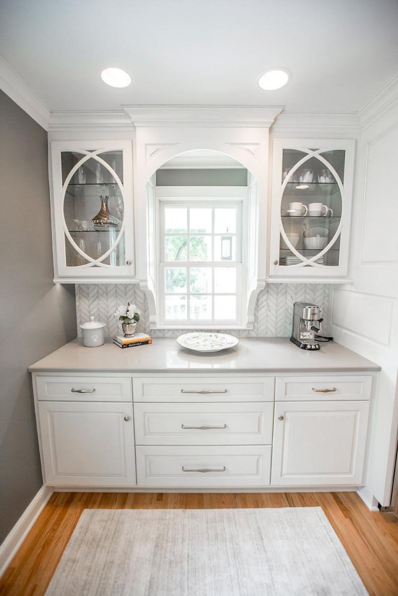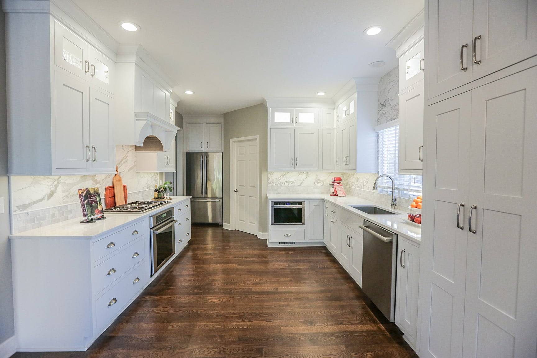 This kitchen remodel in Lees Summit designed by Nina gave the homeowners a current look with tons of natural light. The white kitchen features Shiloh Shaker cabinets with glass doors on the top. The beautiful marble backsplash is brought to the ceiling and perfectly complements the quartz countertops. The brushed nickel hardware ties in perfectly with Thermador appliances.
