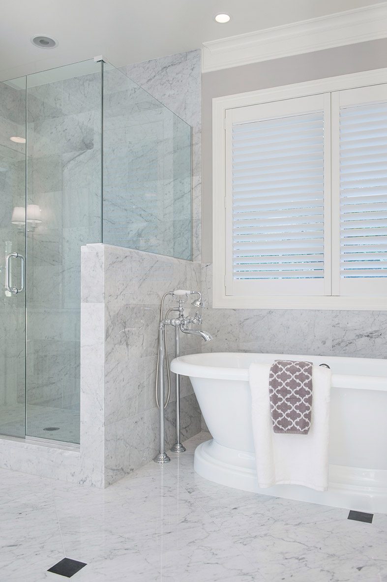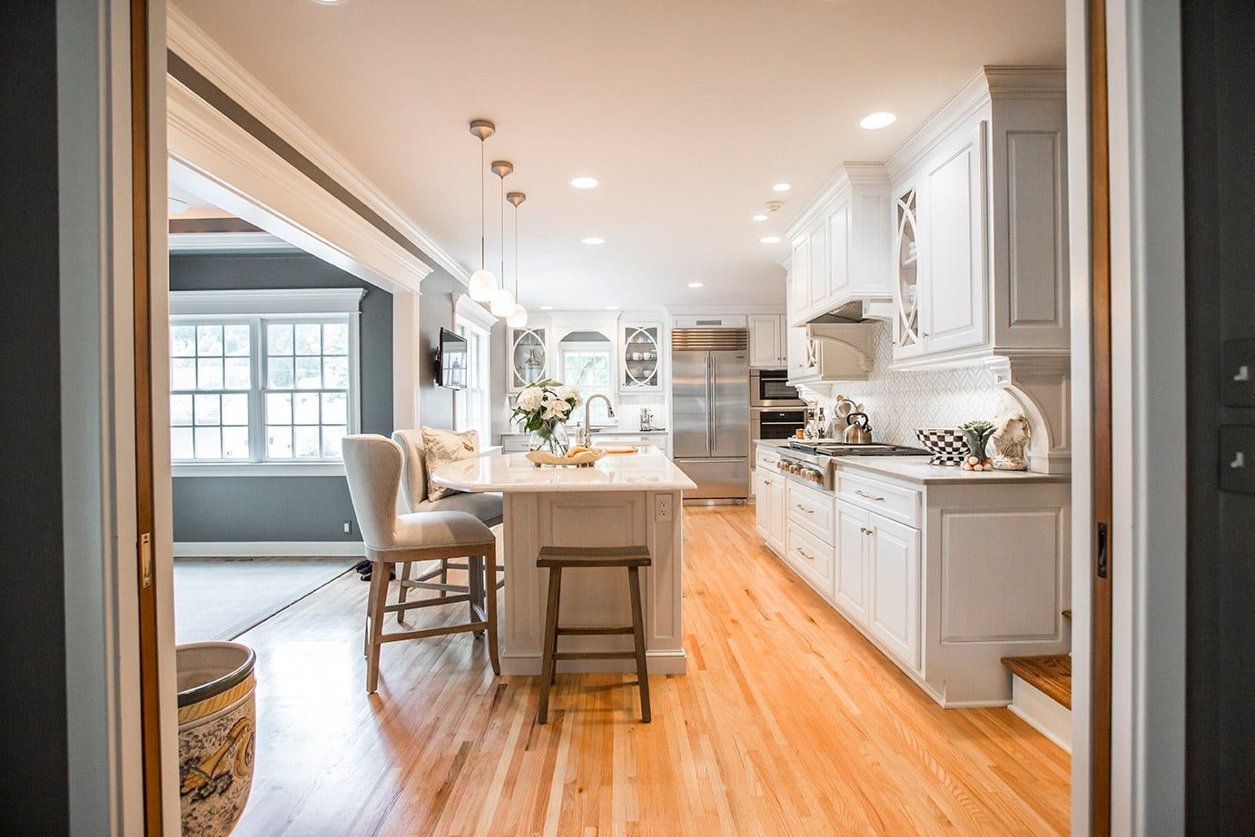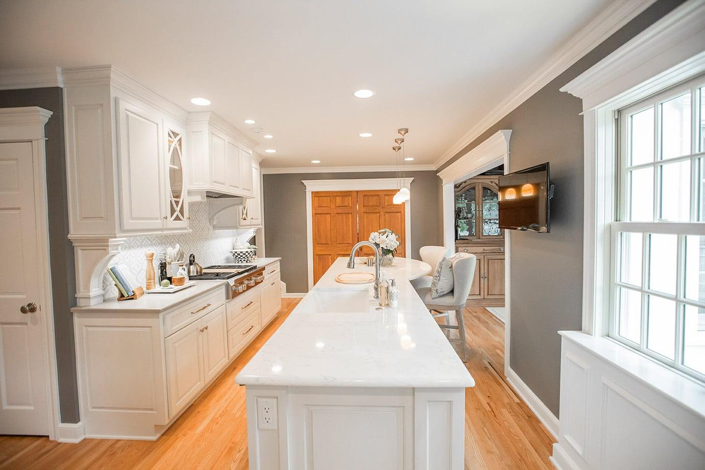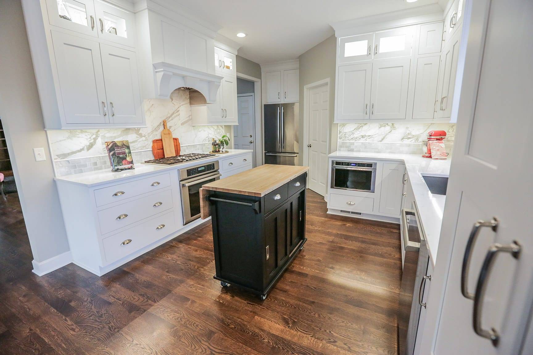 This kitchen remodel in Lees Summit designed by Nina gave the homeowners a current look with tons of natural light. The white kitchen features Shiloh Shaker cabinets with glass doors on the top. The beautiful marble backsplash is brought to the ceiling and perfectly complements the quartz countertops. The brushed nickel hardware ties in perfectly with Thermador appliances.