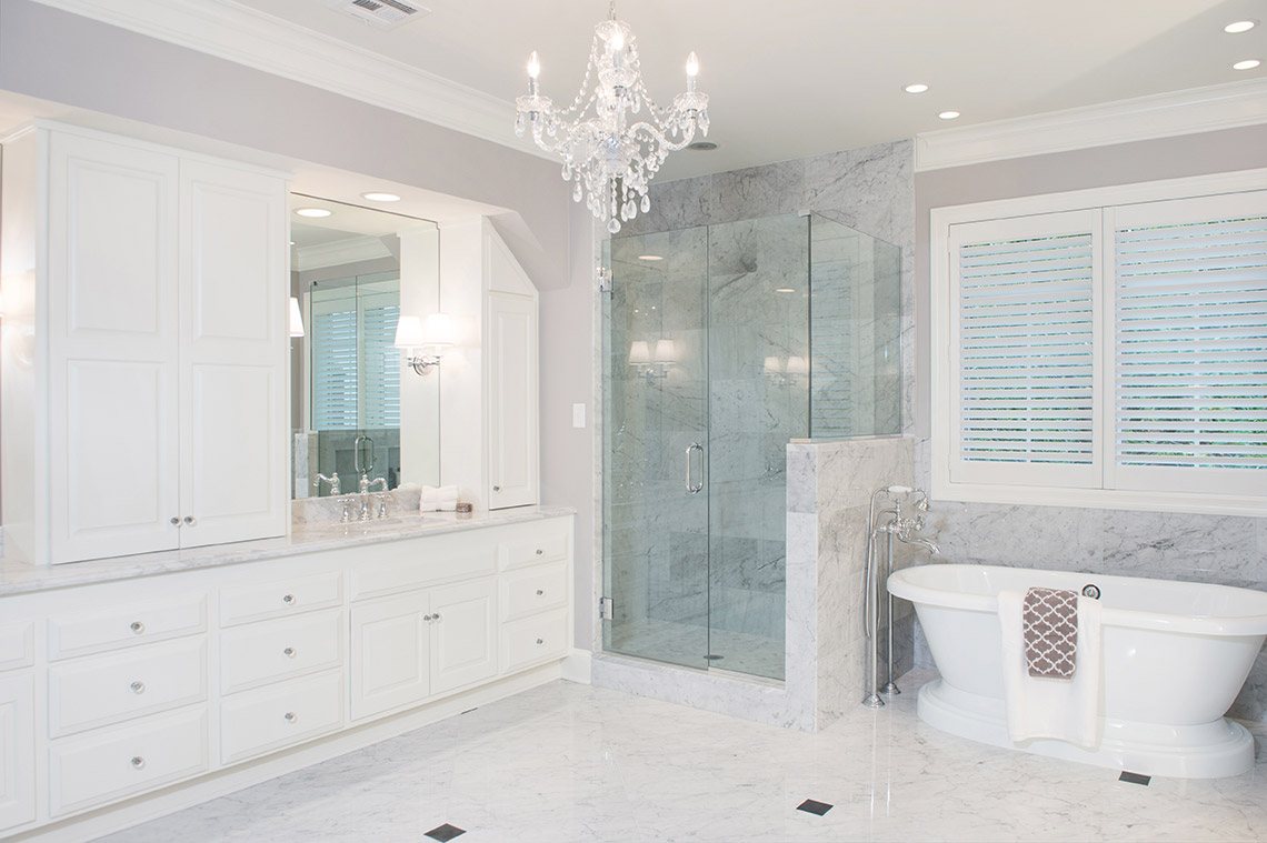 This breathtaking Leawood kitchen was designed by Gayle. The white cabinets are custom by Crestwood and have Statuary Vein marble countertops. The island offers a contrasting countertop with its Nespresso Suede granite. The fridge and freezer have custom paneled fronts tying them in perfectly with the cabinets. The Wolf range is any chef’s dream while the two chandeliers make the perfect statement.