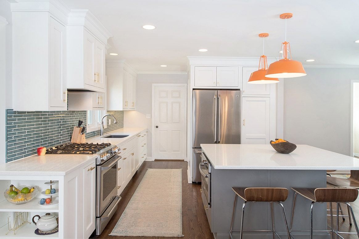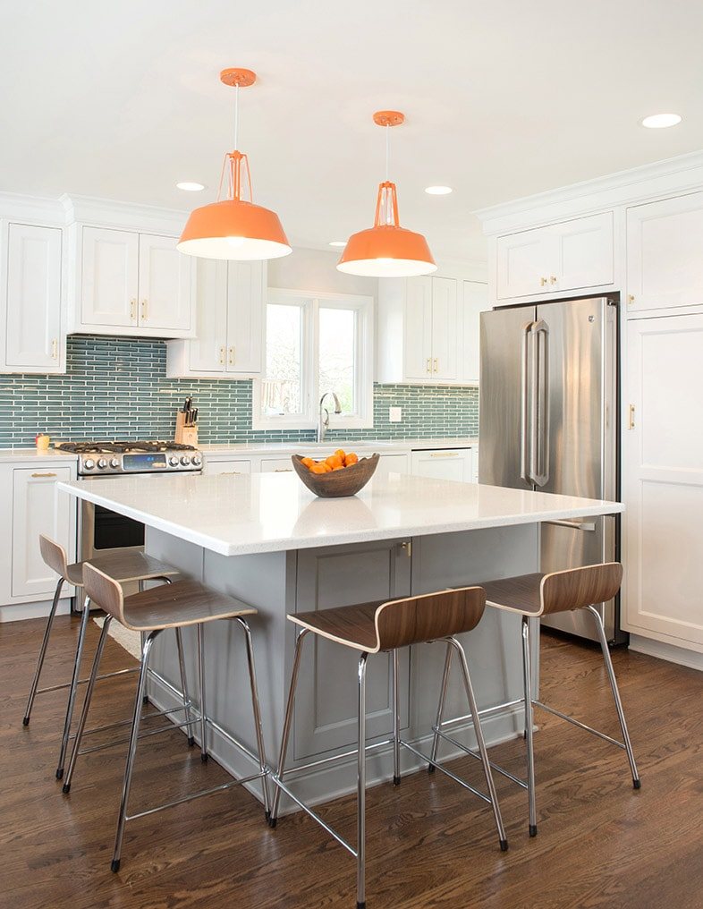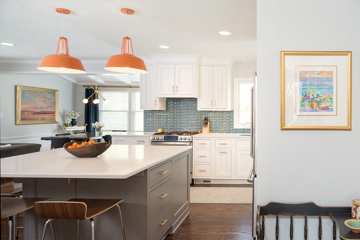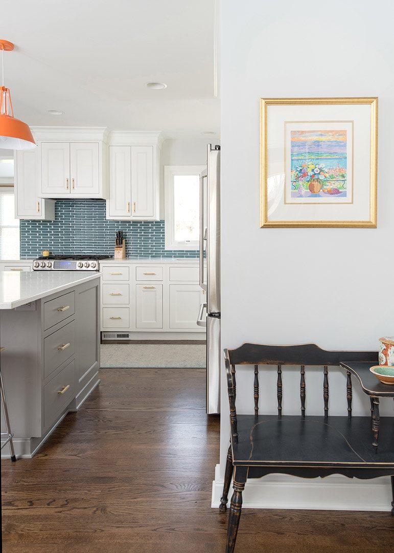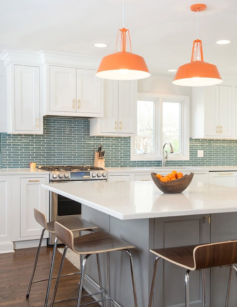 The original kitchen in this Prairie Village home was cramped, outdated and didn’t accommodate modern appliances. Megan was able to turn this space into an open and spacious kitchen with stainless steel appliances and fun colors. The white cabinets and gray island look great with the teal glass tile backsplash and help to showcase the fun orange lamps which were picked by the homeowner.