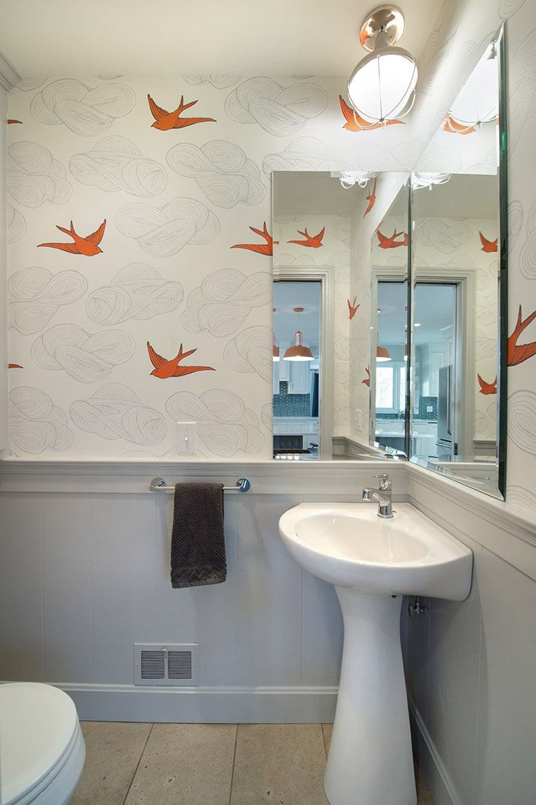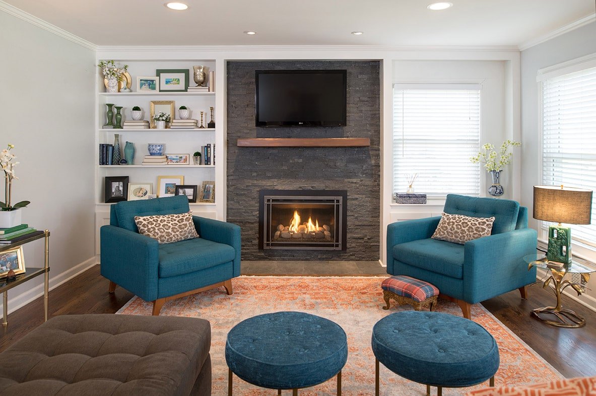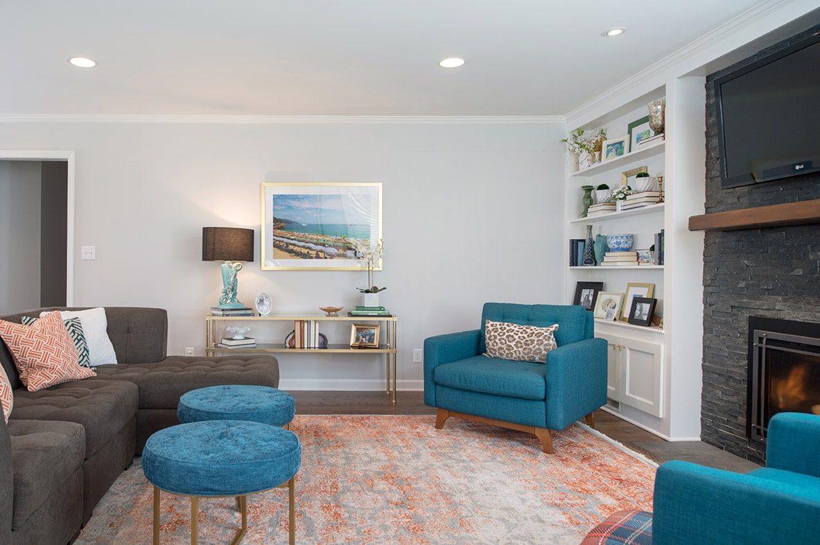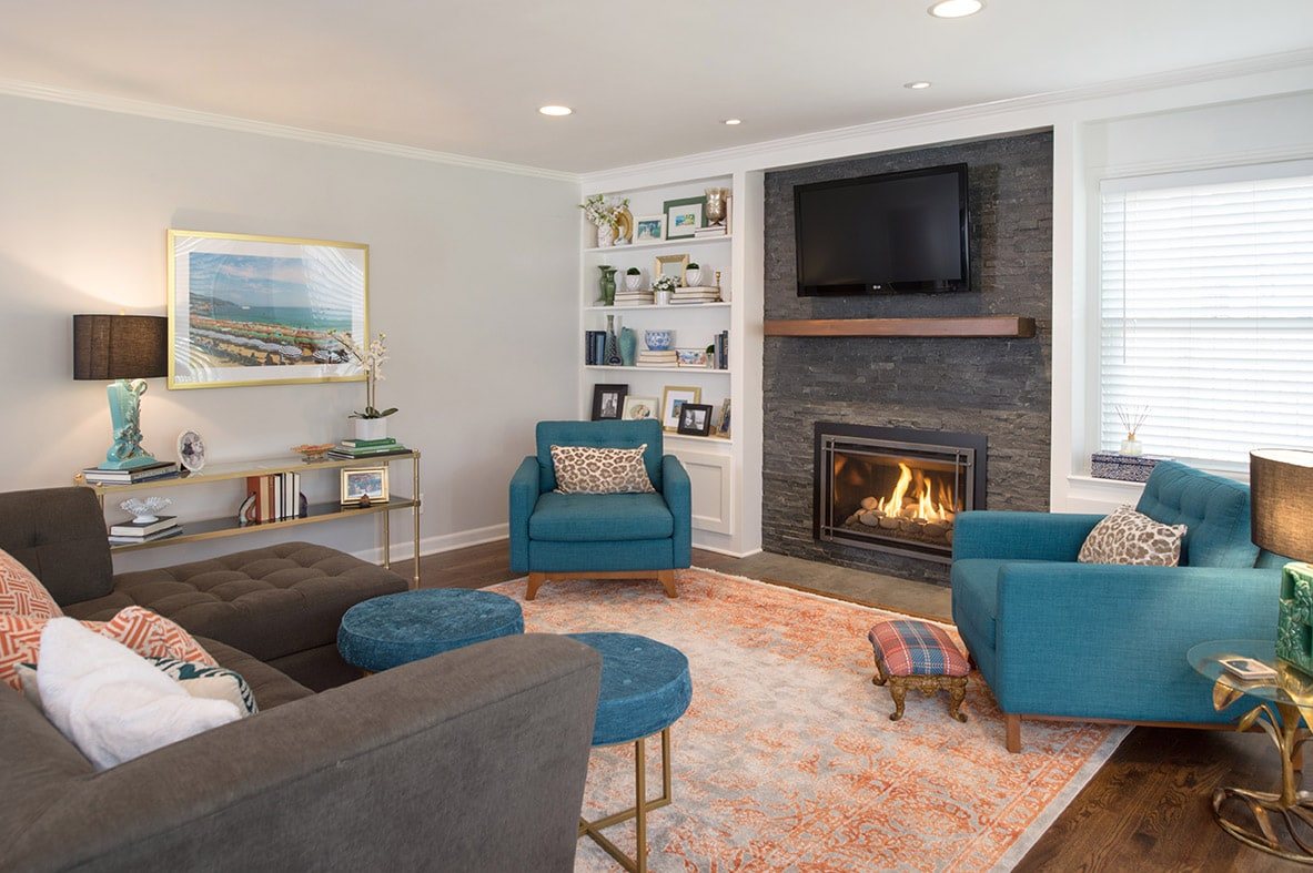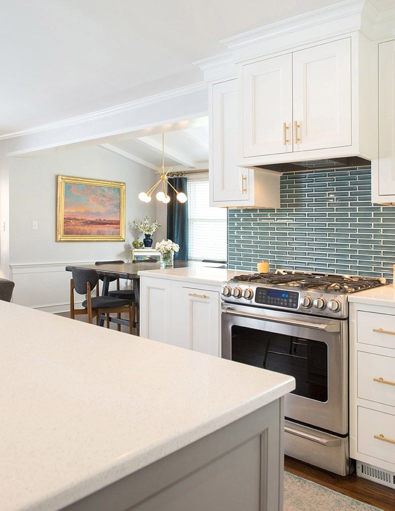 The original kitchen in this Prairie Village home was cramped, outdated and didn’t accommodate modern appliances. Megan was able to turn this space into an open and spacious kitchen with stainless steel appliances and fun colors. The white cabinets and gray island look great with the teal glass tile backsplash and help to showcase the fun orange lamps which were picked by the homeowner.