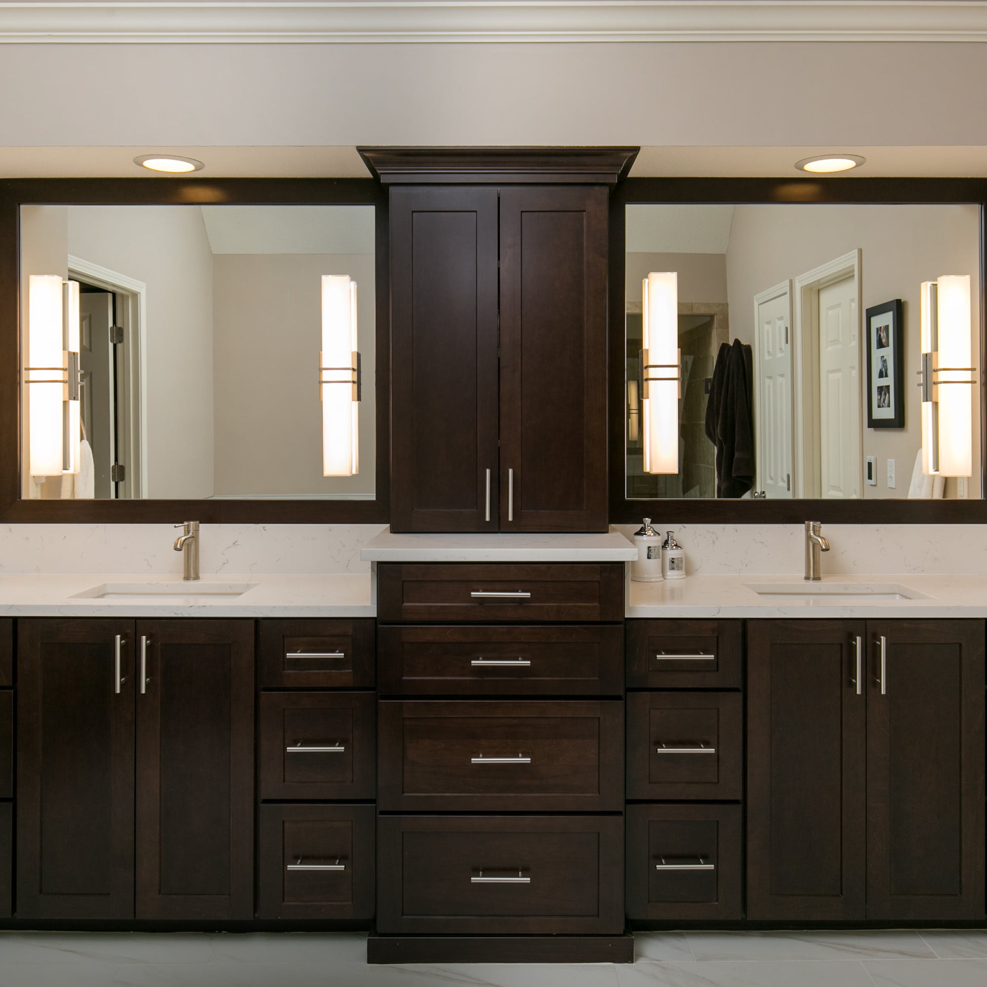 Parkville homeowners sought a rejuvenated primary bathroom, resulting in a stunning transformation. A Kona maple vanity offers ample storage, complemented by striking Ellipse Verona quartz counters that contrast with dark-stained cabinets. Enhanced lighting with mirror sconces ensures optimal illumination for daily preparation. The outcome is a captivating blend of functionality and beauty.