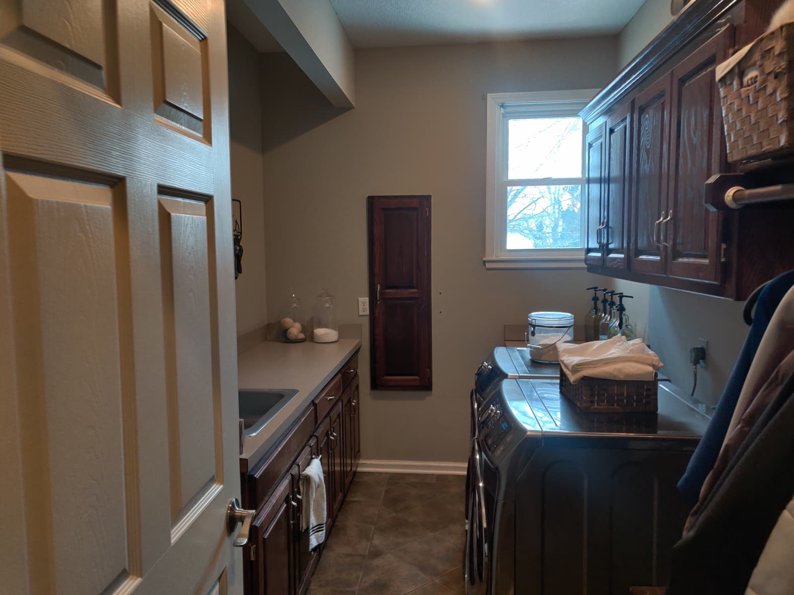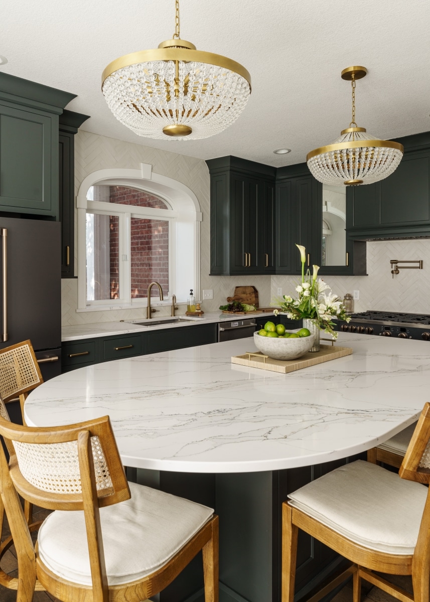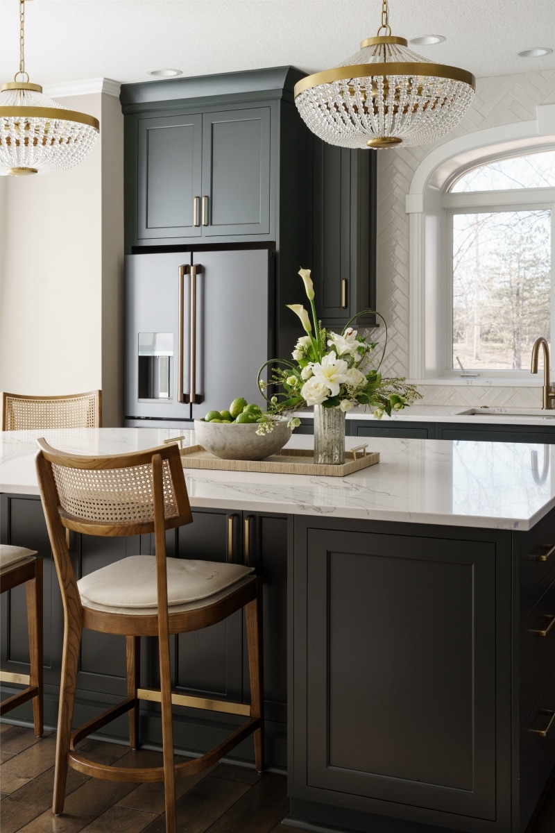 This Overland Park kitchen transformed from dated and heavy to luxurious and glamorous. Dark cabinetry contrasts with bright white quartz countertops and a sleek herringbone backsplash, highlighting the arched window. Brass hardware and a glass chandelier add warmth and glamour, while the expanded island provides stylish seating and ample workspace. We repurposed their laundry room to create a spacious pantry complete with adjustable built-in shelves, two drawer stacks and a countertop.