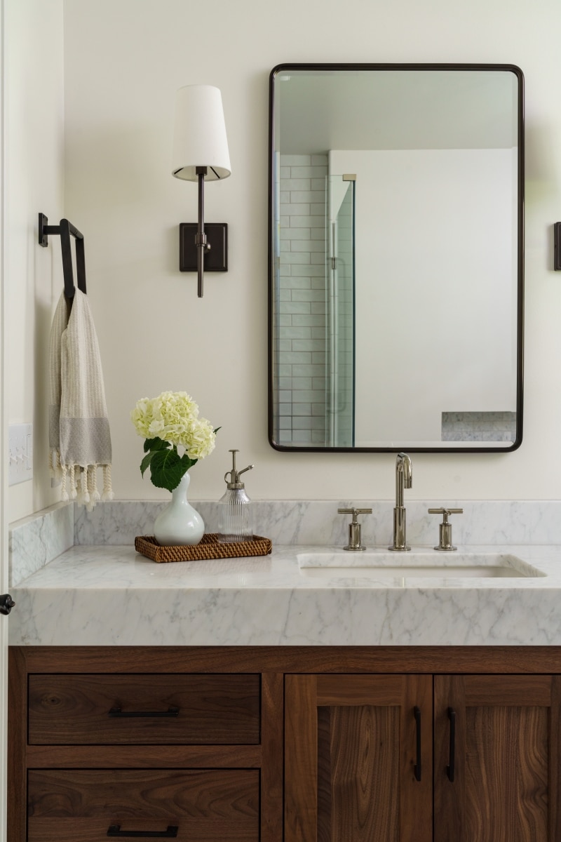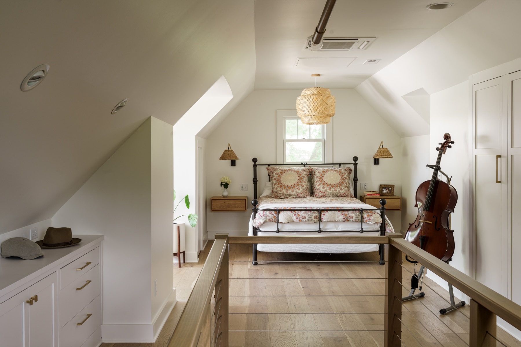 Donna Kirsopp and Kenny Choikhit worked with them to find a solution that reimagined their existing space. On the first floor, we added a mudroom/laundry area with cabinetry and a dog nook, revamped the bathroom with a soaking tub, and maximized storage. Upstairs, we transformed the rustic loft into a functional guest/office space by utilizing hidden attic space and upgraded the half bath into a full bath with a shower. The result: a charming and functional home that truly works for them.
