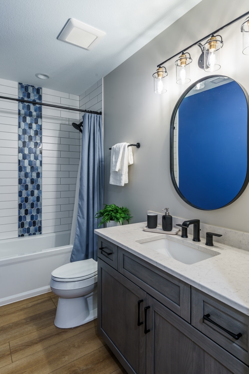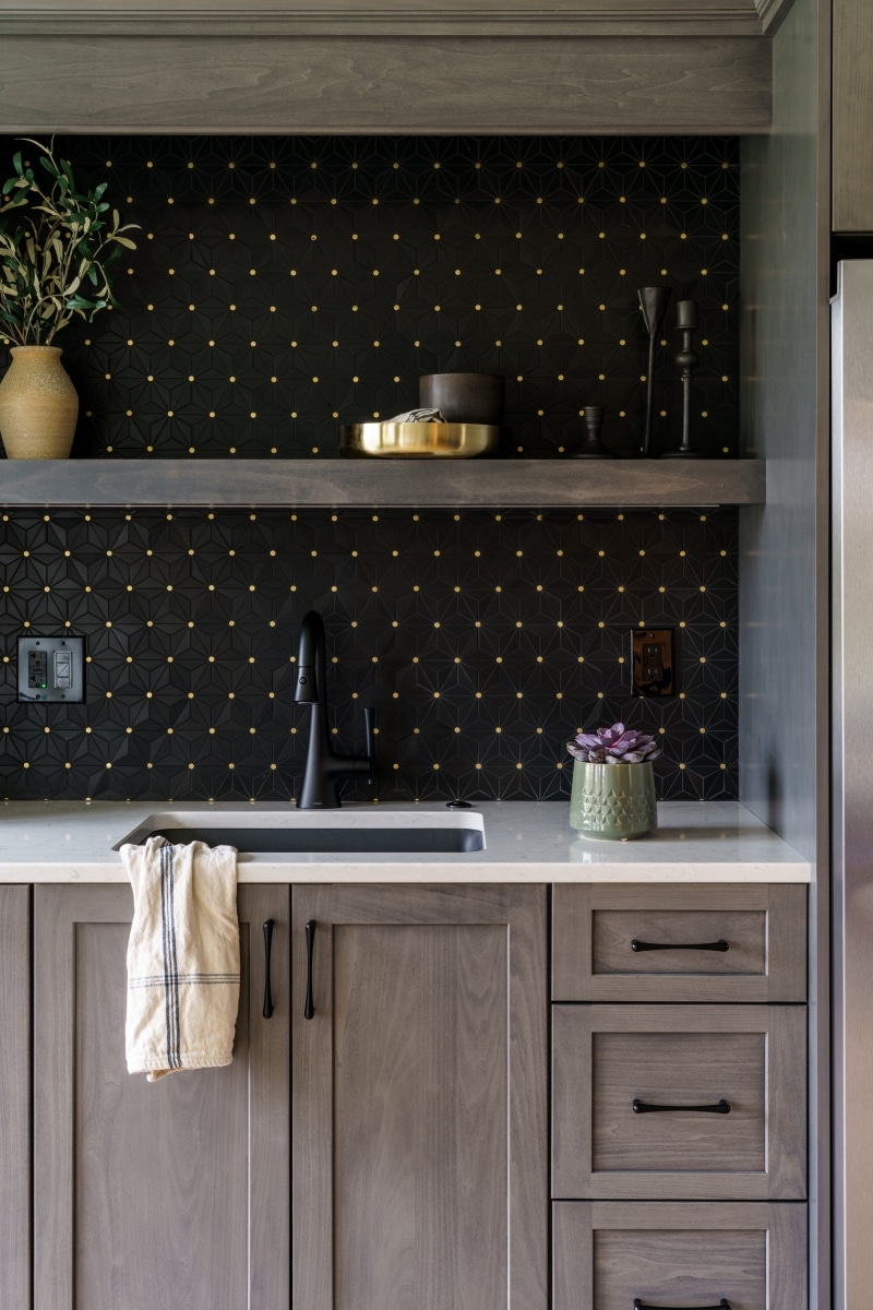 The bar is a standout feature with rich gray cabinetry, a bold geometric backsplash with subtle gold accents, and warm under-shelf lighting that adds a touch of drama. The living area is inviting and comfortable, perfect for relaxing or entertaining. Thoughtful details throughout the space, from the waterproof LVP flooring to the well-placed lighting, make this basement feel intentional and elevated—proving that a lower level can be just as polished as the main floor.