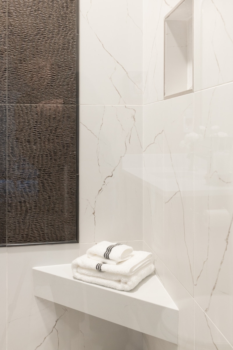 The walk-in shower steals the spotlight with its bold accent tile which adds just the right amount of drama. The floating bench and modern matte black fixtures complete the look of luxury and serenity. It's a bathroom that feels like an escape and is effortlessly inviting.