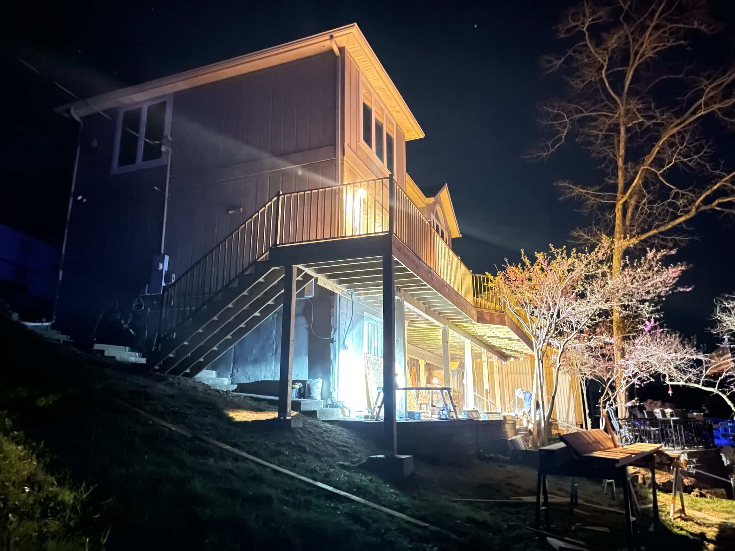 With the deck portion done Emily, Mark, Casey, and Lester got to work putting everything back together. They installed the railing and railing columns, ran all new electrical, and fixed the pavers around the new post piers. They then addressed the wood rot round the sliding door by installing new trim legs. This was a long day for the team as they worked well into night to get it all wrapped up on time.