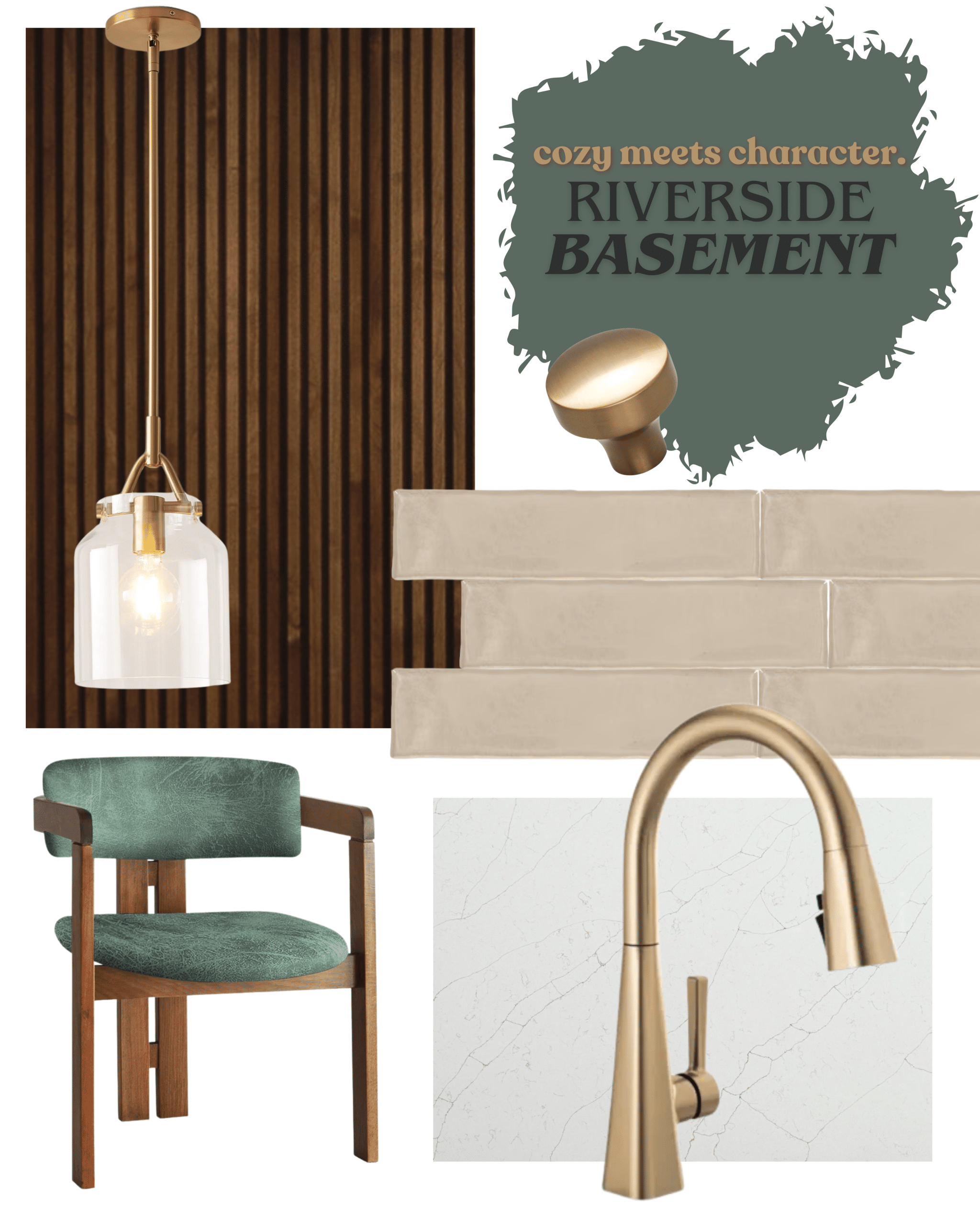 The key to a cozy basement is selecting finishes that add warmth and personality. For this particular project, we worked with our clients to choose an earth toned and cozy color palette. Think warm golds, stained wood, the perfect shade of green, and rich browns. This combination of tones immediately makes the space feel calm and cozy but still full of character.