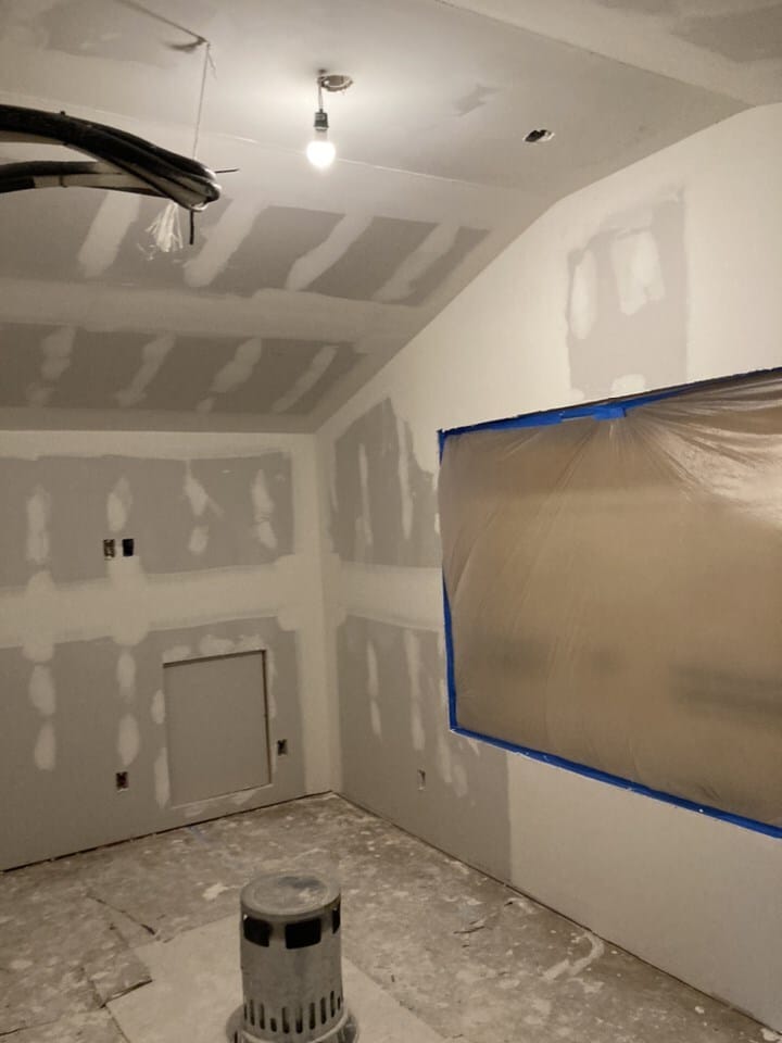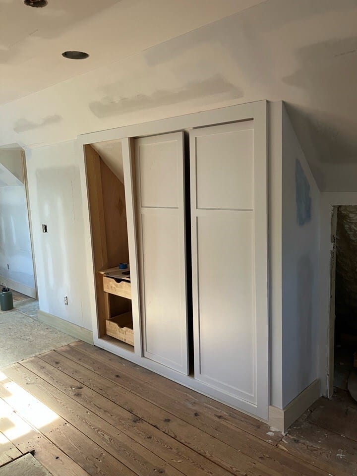 Here, the drywall and all new electrical work are completed. We transformed one of the crawl spaces into a compact closet, adding a practical storage option. The other crawl space remained as it was, providing continued access to utilities.
