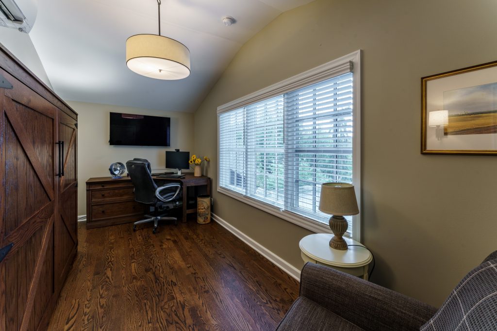 This remodel was wrapped up just before we converted our client’s screened-in porch into a three-season room. To see more about this project, visit our blog post here! Just above the porch was a small attic space, which our clients envisioned as having untapped potential. They dreamed of a home office overlooking their beautifully landscaped backyard. Designer Nina Schmidt brought this vision to life with a dormer addition that expanded the square footage and allowed for a spacious, light-filled office. With this clever design, the new space now serves not only as a functional workspace but also as a cozy guest room whenever needed.