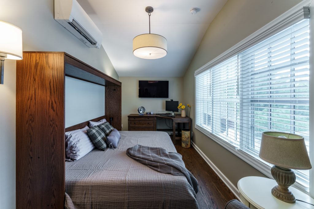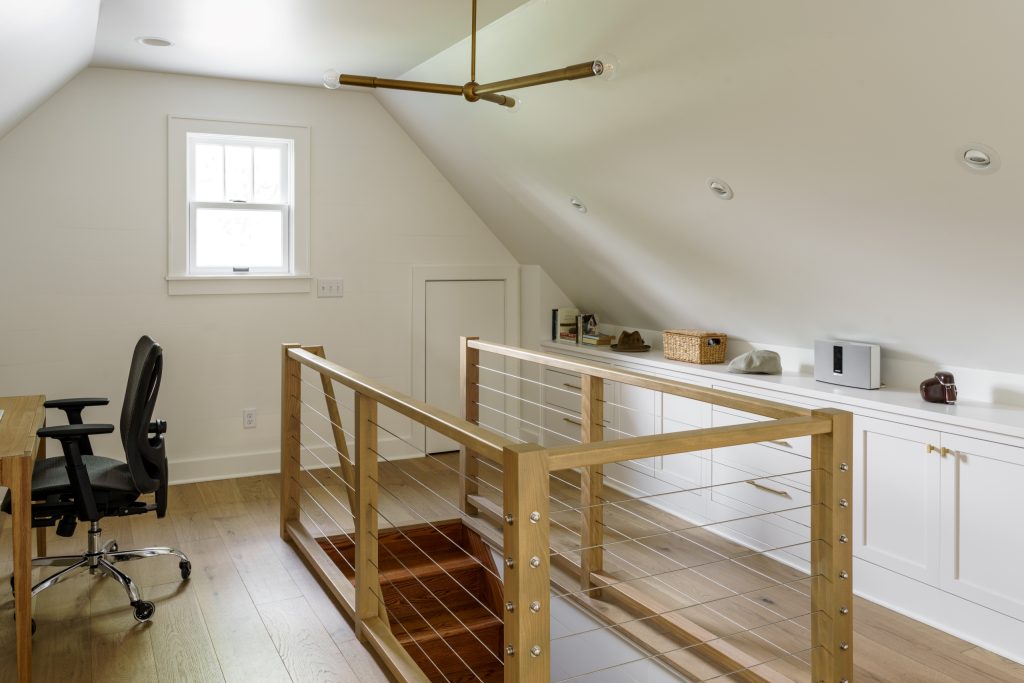 This new home office makes it hard to believe it used to be a small section of an unfinished attic. The new dormer provides plenty of vertical space, and the large window makes the space inviting and bright. We installed hardwood floors and a wall-mounted mini split unit. For a truly multi-purpose space, we installed a Murphy bed for when our clients have guests.