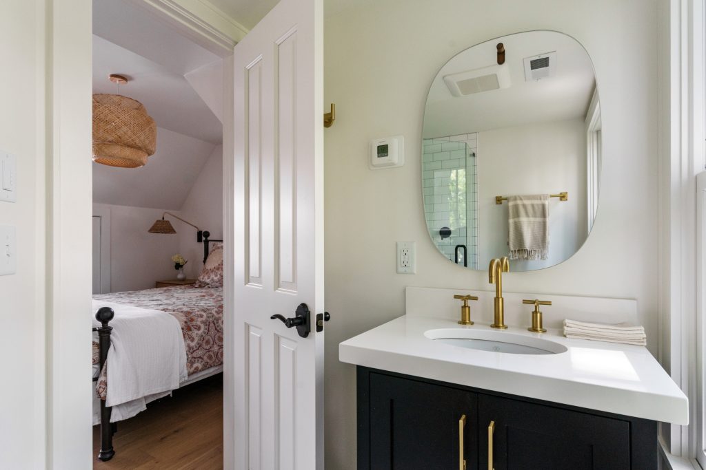 We redesigned the bathroom to include a full shower, enhancing the suite’s amenities. We also installed a new furniture-style vanity with a quartz countertop and a modern toilet. The entire space is accented by brass and matte black fixtures for a sleek, updated look.