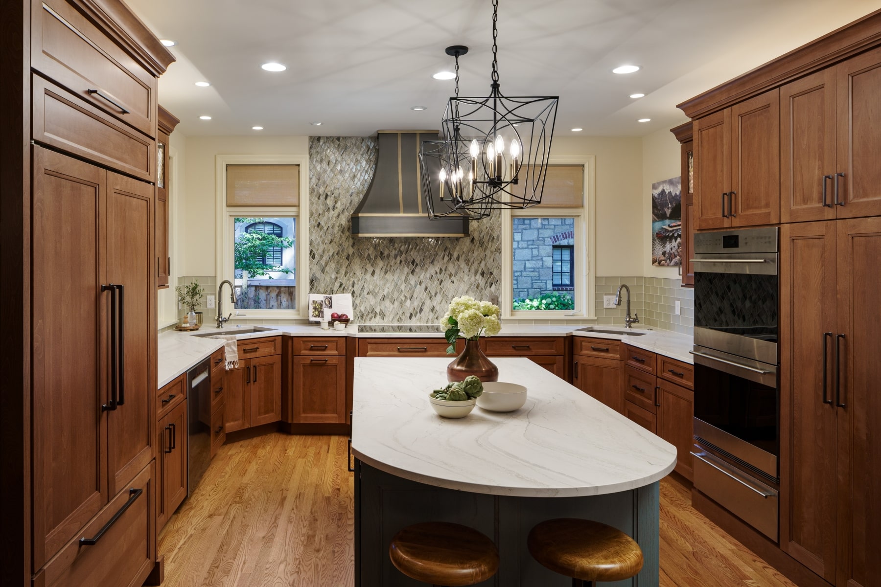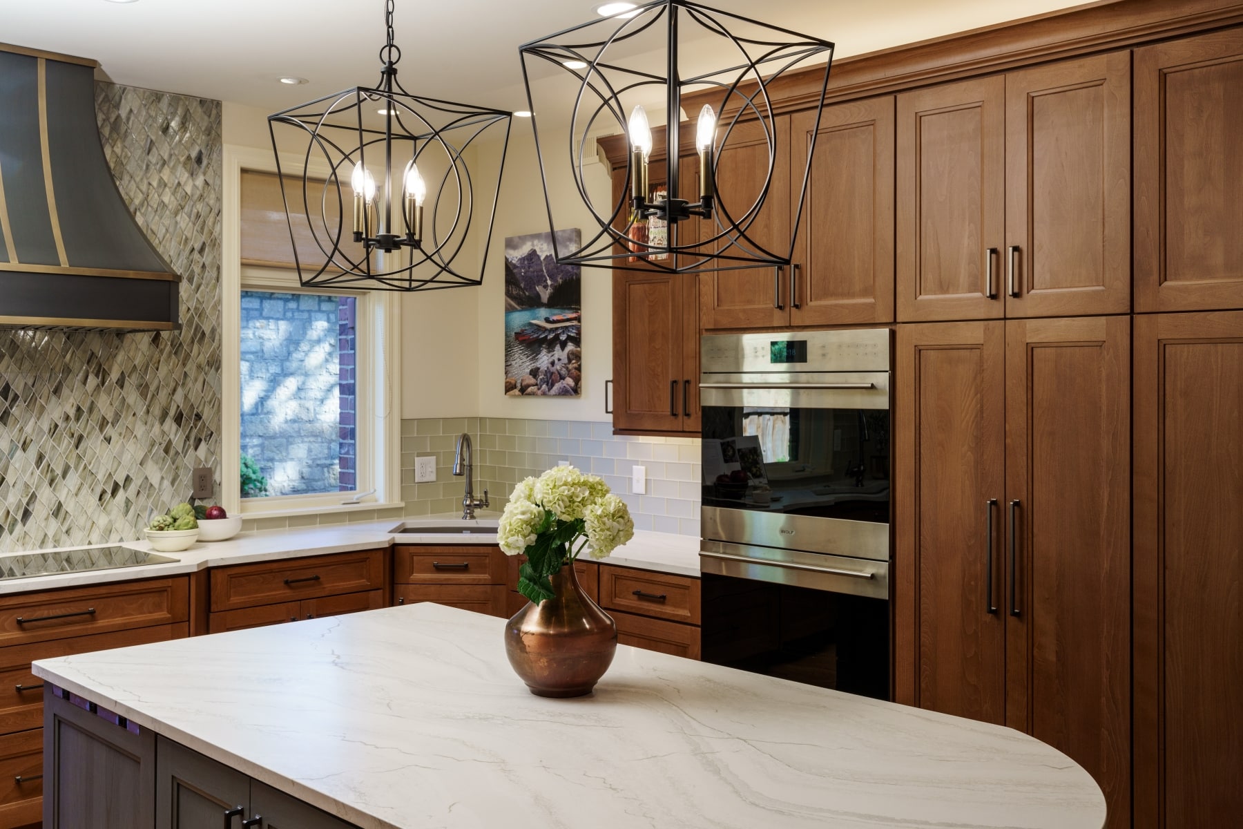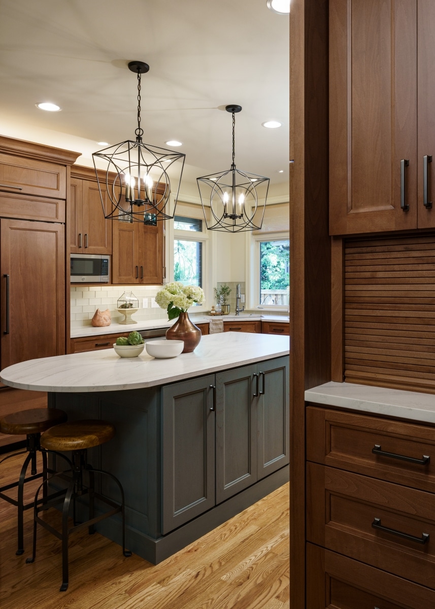 This Mission Hills kitchen is an example of how thoughtful updates can make a big impact without the need for a total reimagination. This project focused on enhancing functionality while preserving the homeowner's style with a fresh, updated look. Donna Kirsopp and Kenny Choikhit worked with these clients to really understand their lifestyle and daily needs to craft a kitchen tailored to them. The perimeter cabinetry was replaced, but maintained the same color and style with more convenient features and locations. With some of the old cabinetry removed, we were able to create a more open feeling around the sink and cooking area, making way for a sleek range hood and striking mosaic tile backsplash. Our clients opted to keep the dual sinks to allow multiple cooks to work comfortably. The island also go a functional update with integrated outlets, an extended countertop to allow seating, and a darling soft blue color. Mirroring this pop of color is a new buffet. To keep everyday clutter at bay, an end cap near the exterior door serves as as smart drop zone with a roll-up door for discreet storage. The result is a refreshed, more functional kitchen with plenty of charm.