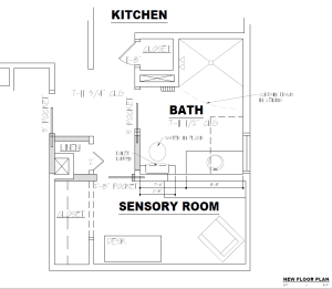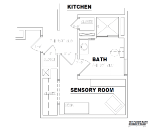 The main floor bathroom is the bathroom Macy uses and the one we really want to make accessible. First, we created a large, zero-entry shower so as Macy gets older her mom will be able to wheel here in. To accommodate her chair, we’re also enlarging the doors to Macy’s bedroom, bathroom, and the sensory room. With large pocket doors, here mom can easily wheel her from her room directly across to the bathroom. To provide proficient space in the hallway for her chair we’ll take a bit of space from the sensory room closet and reposition the hall linen closet.