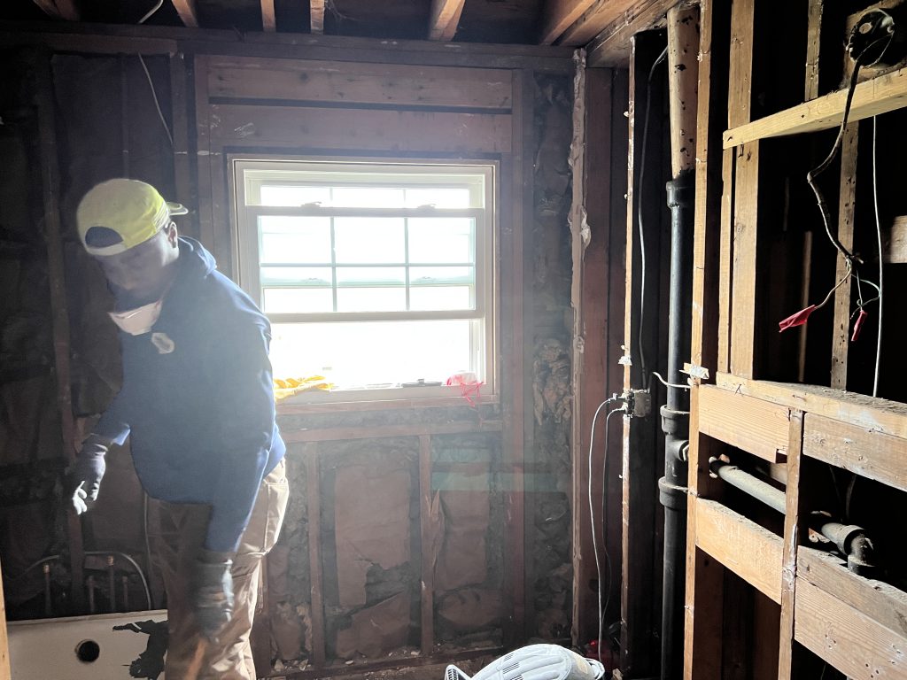 Kelly made a plan to start with the upstairs bathroom and get it fully usable before starting on the main floor bath. The bathroom square footage is fairly small so a few small changes go a long way. We’re removing the pedestal sink and linen and replacing it with a narrow vanity and smaller linen. This will give them counter space for getting ready and below sinks storage. The linen will be lockable so Erica can store meds for the kids without worrying about them getting in. Another small change we did was moved the plumbing from the exterior wall to an interior wall. This will prevent the pipes from ever freezing.